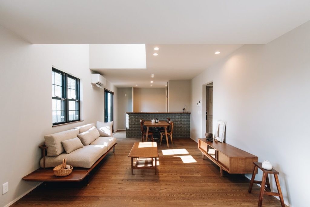 将来的には1Fだけで過ごせるよう考えられた、吹き抜けのある心地よいひだまりができるモデルハウス。