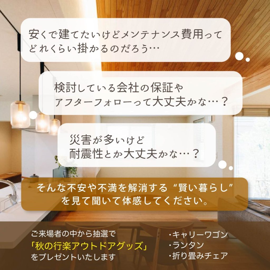 ※新しくお家づくりを考えている方で、ご来場アンケートを記入して頂いた方から抽選させていただきます。当選者は商品の発送をもって替えさせていただきます。