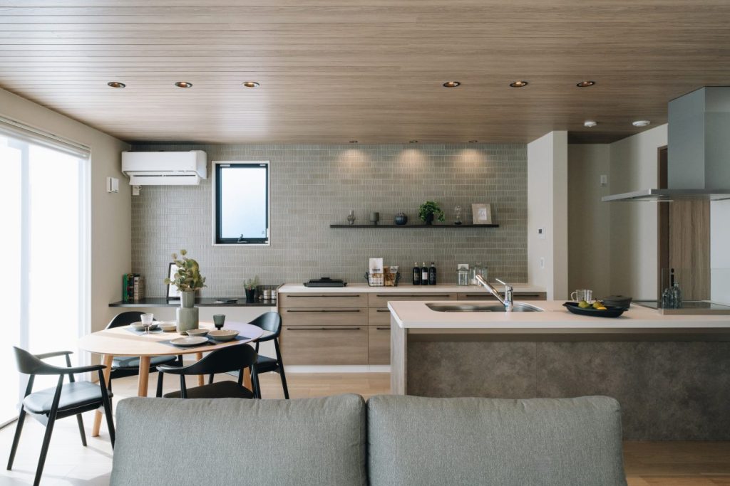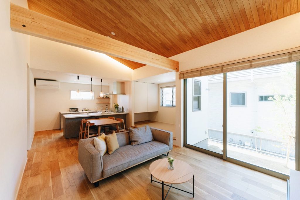 板張りの勾配天井と梁アラワシで木の温かみを感じられる大開放な空間で、家族との団らんを楽しめるお住まい