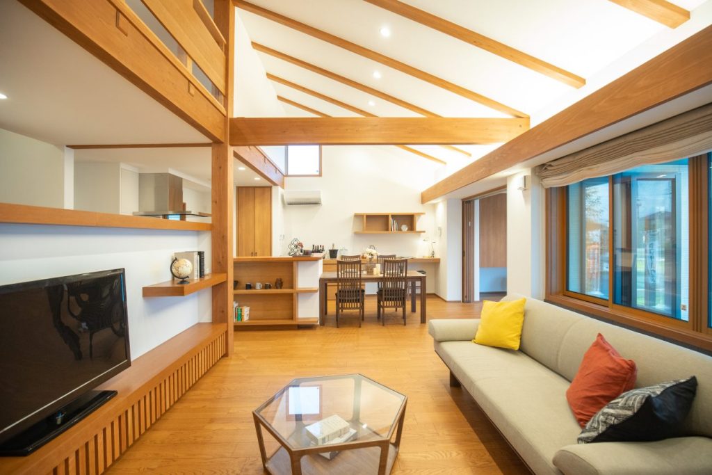 板張りの勾配天井と梁アラワシで木の温かみを感じられる大開放な空間で、家族との団らんを楽しめるお住まい