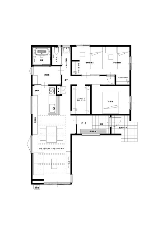 リビングから離れたところに、寝室と子供部屋を設けることで、プライバシーを確保し家族それぞれがくつろげる空間に。